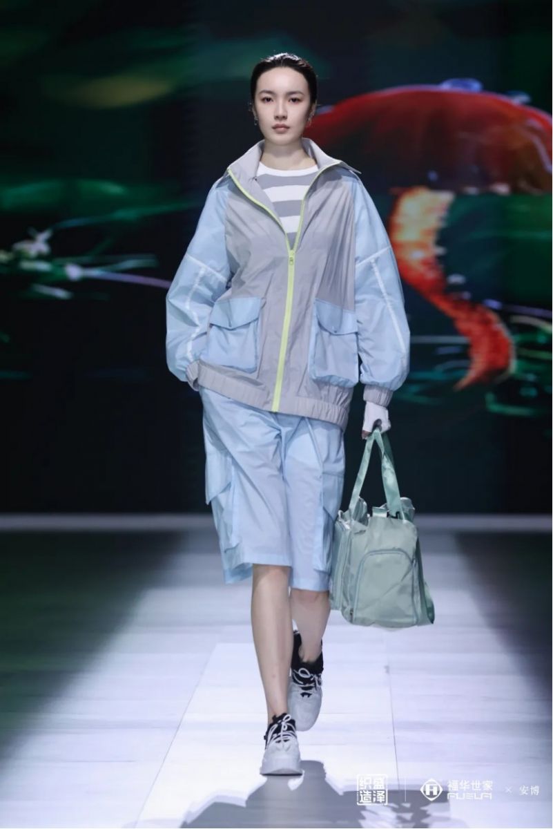 本系列設計色彩取之于自然萬物中的天、地、水、植,例如嫩芽黃、萊姆綠、香水藍等等。同時在面料上的選擇也考慮到了不同溫度環境下的穿著體驗,包括不同克重的錦綸、滌綸面料,同時考慮到了環保因素,一部分漁網回收的錦綸同樣運用到了此系列中。通過色彩與面料的巧妙搭配,讓本系列整體風格顯得明快自然、舒適閑逸,通勤與戶外的有機結合,也讓此類輕戶外風格更能得到當下消費者的青睞。